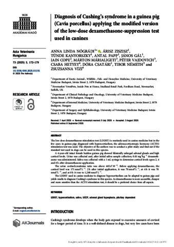 Nógrádi, Anna Linda and Ziszisz, Árisz and Kanyorszky, Tünde and Papp, Antal and Gál, János and Cope, Iain and Márialigeti, Márton and Vajdovich, Péter and Hetyey, Csaba and Csatári, Dóra and Németh, Tibor and Vízi, Zsuzsanna (2025) Diagnosis of Cushing's syndrome in a guinea pig (Cavia porcellus) applying the modified version of the low-dose dexamethasone-suppression test used in canines. ACTA VETERINARIA HUNGARICA, 73 (3). pp. 172-179. ISSN 0236-6290