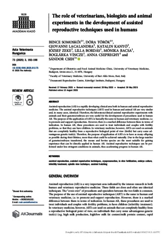 Somoskői, Bence and Török, Dóra and Lacalandra, Giovanni and Kanyó, Katalin and Zeke, József and Bordás, Lilla and Bacsa, Mónika and Vincze, Boglárka and Csepreghy, Anna and Cseh, Sándor (2025) The role of veterinarians, biologists and animal experiments in the development of assisted reproductive techniques used in humans. ACTA VETERINARIA HUNGARICA, 73 (3). pp. 192-198. ISSN 0236-6290