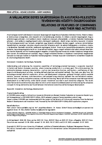 A technológiaorientált vállalkozások innovációs képességeinek megértése és fejlesztése különösen fontos, főként a közép- és kelet-európai országokban, ahol alapvető cél a termelékenység növelése. A cikkben a szerzők megvizsgálják, hogy a vállalatok egyes jellemzői – mint például a méret, tulajdonosi viszonyok, elhelyezkedés – a kutatási, fejlesztési tevékenység jellemzői – mint például a megfogalmazott célok, alkalmazott módszerek – között milyen mértékű a kapcsolat. A kutatás 102 technológiaorientált ipari termelő, szolgáltató vagy fejlesztő vállalkozás körében végzett, nyilvános statisztikákban hozzáférhető és személyes interjúkon alapuló empirikus felmérésre épült. Az adatok feldolgozása a mintához a kutatási kérdésekhez illeszkedő statisztikai módszerek segítségével történt. Ennek során kereszttábla-elemzésekre, statisztikai tesztekre, hasonlóságvizsgálatra került sor. A szerzők azt találták, hogy a vizsgált vállalatok által adott válaszok közel felében kísérleti fejlesztés volt K+F tevékenységként megadva. A kisebb folyamatinnovációk minden tulajdonosi kategóriában jelen vannak. Az eredmények azt mutatják, hogy a vizsgált vállalatok körében a tulajdonosi viszonyoknak meghatározó szerepük van bizonyos kutatási és fejlesztési tevékenységekben. Erőteljes kapcsolat mutatkozott a nemzetközi tulajdonlás és a technológiafejlesztés között. | Understanding and enhancing the innovation capabilities of technology-oriented businesses is especially important in Central and Eastern European countries, where increasing productivity is a primary goal. This article examines the relationship between company characteristics – such as size, ownership structure, and location – and features of their research and development activities, including defined objectives and applied methods. The study uses data from 102 technology-oriented industrial production, service, and development companies, gathered through publicly available statistics, personal interviews, and observations, and analyzed using statistical methods like cross-tabulation analyses, statistical tests, similarity and pattern analyses, and machine learning. Nearly half of the companies reported experimental development as an R&D activity, while smaller process innovations occurred in each ownership categories. The results show that ownership relationships play a decisive role in certain research and development activities among the companies surveyed. A strong relationship was found between international ownership and technological development.