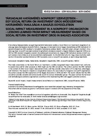 A tanulmány középpontjában az egyik legismertebb hatásmérési eszköz, a Social Return on Investment vizsgálata áll, és célja egy hazai alkalmazásán keresztül feltárni, hogy egy civil szervezet mire és hogyan használhatja az SROI-kalkulációt. A szerzők elhelyezik az SROI-módszert a társadalmi hatásmérés eszközei között, ismertetik céljait, előnyeit, korlátait. A kutatás egy hazai nonprofit szervezet esetének longitudinális elemzésén alapszik: a Bagázs Közhasznú Egyesület 2016-os és 2021-es SROI-méréseit vizsgálják a szerzők. Az eredmények rámutatnak arra, hogy az SROI-kalkuláció számos érintetti csoport számára kínál értékes és jól kommunikálható eredményeket. A cikk áttekintést ad arról, hogy milyen technikai-módszertani kihívásokkal szembesülhetnek az SROI használata során a nonprofit szervezetek, és ezek miképp kezelhetők. | The study concentrates on the Social Return on Investment, a widely recognized impact measurement tool, and aims to explore how and for what purposes an NGO might use the SROI calculation. The authors position the SROI method in the context of other social impact measurement tools, and they provide a description of its objectives, advantages, and limitations. The research is based on a longitudinal analysis of a case study of a Hungarian non-profit organization: the authors analyze the SROI applications of the Bagázs Association in 2016 and 2021. The results indicate that the SROI calculation provides valuable and communicable results for various stakeholder groups. The paper outlines the technical and methodological problems organizations could face while implementing SROI and suggests potential solutions.