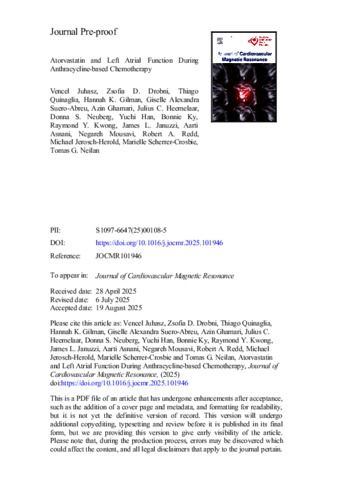Juhasz, Vencel and Drobni, Zsofia D. and Quinaglia, Thiago and Gilman, Hannah K. and Suero-Abreu, Giselle Alexandra and Ghamari, Azin and Heemelaar, Julius C. and Neuberg, Donna S. and Han, Yuchi and Ky, Bonnie and Kwong, Raymond Y. and Januzzi, James L. and Asnani, Aarti and Mousavi, Negareh and Redd, Robert A. and Jerosch-Herold, Michael and Scherrer-Crosbie, Marielle and Neilan, Tomas G. (2025) Atorvastatin and Left Atrial Function During Anthracycline-based Chemotherapy. JOURNAL OF CARDIOVASCULAR MAGNETIC RESONANCE. No. 101946. ISSN 10976647 (In Press)