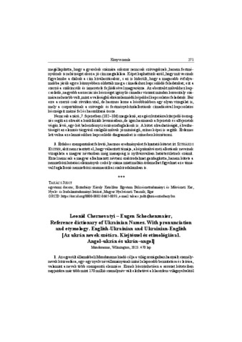 Sebestyén, Zsolt (2025) Leonid Chernovatyi – Eugen Schochenmaier, Reference dictionary of Ukrainian Names. With pronunciation and etymology. English-Ukrainian and Ukrainian-English : [Az ukrán nevek szótára. Kiejtéssel és etimológiával. Angol–ukrán és ukrán–angol]. NÉVTANI ÉRTESÍTŐ, 47. pp. 271-274. ISSN 0139-2190