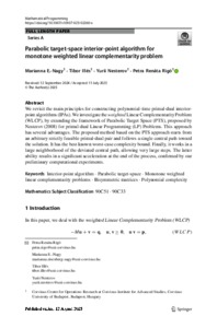 Eisenberg-Nagy, Marianna and Illés, Tibor and Nesterov, Yurii and Rigó, Petra Renáta (2025) Parabolic target-space interior-point algorithm for monotone weighted linear complementarity problem. MATHEMATICAL PROGRAMMING. ISSN 0025-5610 (In Press)