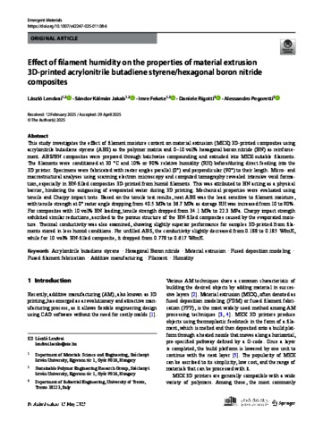 Lendvai, László and Jakab, Sándor Kálmán and Fekete, Imre and Rigotti, Daniele and Pegoretti, Alessandro (2025) Effect of filament humidity on the properties of material extrusion 3D-printed acrylonitrile butadiene styrene/hexagonal boron nitride composites. EMERGENT MATERIALS. ISSN 2522-5731 (In Press)