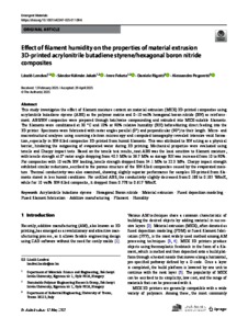 This study investigates the effect of filament moisture content on material extrusion (MEX) 3D-printed composites using acrylonitrile butadiene styrene (ABS) as the polymer matrix and 0–10 vol% hexagonal boron nitride (BN) as reinforcement. ABS/BN composites were prepared through batchwise compounding and extruded into MEX-suitable filaments. The filaments were conditioned at 30 °C and 10% or 90% relative humidity (RH) before/during direct feeding into the 3D printer. Specimens were fabricated with raster angles parallel (0°) and perpendicular (90°) to their length. Micro- and macrostructural analyses using scanning electron microscopy and computed tomography revealed intensive void formation, especially in BN-filled composites 3D-printed from humid filaments. This was attributed to BN acting as a physical barrier, hindering the outgassing of evaporated water during 3D printing. Mechanical properties were evaluated using tensile and Charpy impact tests. Based on the tensile test results, neat ABS was the least sensitive to filament moisture, with tensile strength at 0° raster angle dropping from 40.5 MPa to 36.7 MPa as storage RH was increased from 10 to 90%. For composites with 10 vol% BN loading, tensile strength dropped from 34.1 MPa to 22.3 MPa. Charpy impact strength exhibited similar reductions, ascribed to the porous structure of the BN-filled composites caused by the evaporated moisture. Thermal conductivity was also examined, showing slightly superior performance for samples 3D-printed from filaments stored in less humid conditions. For unfilled ABS, the conductivity slightly decreased from 0.188 to 0.185 W/mK, while for 10 vol% BN-filled composite, it dropped from 0.778 to 0.617 W/mK.