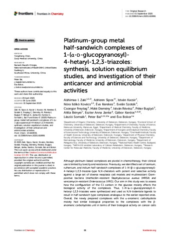 Salama, Alshimaa Ibrahim Zaki Ahmed and Sipos, Adrienn and Kacsir, István and Kovács, Nóra Ildikó and Kerekes, Éva and Szoták, Evelin and Freytag, Csongor and Demény, Máté Ágoston and Révész, István and Buglyó, Péter and Bényei, Attila Csaba and Janka, Eszter Anna and Kardos, Gábor and Somsák, László and Bay, Péter and Bokor, Éva (2025) Platinum-group metal half-sandwich complexes of 1-(alpa-D-glucopyranosyl)-4-hetaryl-1,2,3-triazoles : synthesis, solution equilibrium studies and investigation of their anticancer and antimicrobial activitie. FRONTIERS IN CHEMISTRY, 13. ISSN 2296-2646 (In Press)