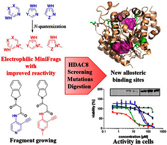 Screening of ultra-low-molecular weight ligands (MiniFrags) successfully identified viable chemical starting points for a variety of drug targets. Here we report the electrophilic analogues of MiniFrags that allow the mapping of potential binding sites for covalent inhibitors by biochemical screening and mass spectrometry. Small electrophilic heterocycles and their N-quaternized analogues were first characterized in the glutathione assay to analyze their electrophilic reactivity. Next, the library was used for systematic mapping of potential covalent binding sites available in human histone deacetylase 8 (HDAC8). The covalent labeling of HDAC8 cysteines has been proven by tandem mass spectrometry measurements, and the observations were explained by mutating HDAC8 cysteines. As a result, screening of electrophilic MiniFrags identified three potential binding sites suitable for the development of allosteric covalent HDAC8 inhibitors. One of the hit fragments was merged with a known HDAC8 inhibitor fragment using different linkers, and the linker length was optimized to result in a lead-like covalent inhibitor. © 2023 The Authors. Published by American Chemical Society