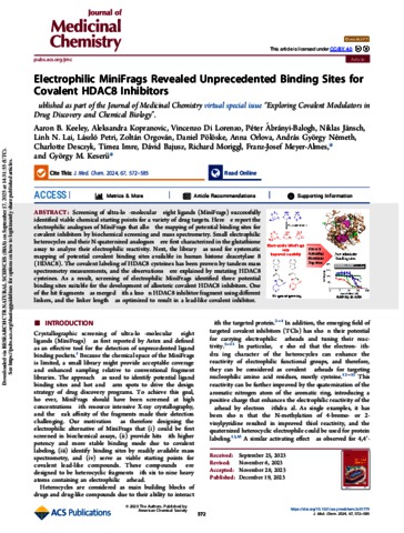 Keeley, Aaron Brian and Kopranovic, Aleksandra and Di Lorenzo, Vincenzo and Ábrányi-Balogh, Péter and Jänsch, Niklas and Lai, Linh N. and Petri, László and Orgován, Zoltán and Pölöske, Daniel and Orlova, Anna and Németh, András György and Desczyk, Charlotte and Imre, Timea and Bajusz, Dávid and Moriggl, Richard and Meyer-Almes, Franz-Josef and Keserű, György Miklós (2024) Electrophilic MiniFrags Revealed Unprecedented Binding Sites for Covalent HDAC8 Inhibitors. JOURNAL OF MEDICINAL CHEMISTRY, 67 (1). pp. 572-585. ISSN 0022-2623