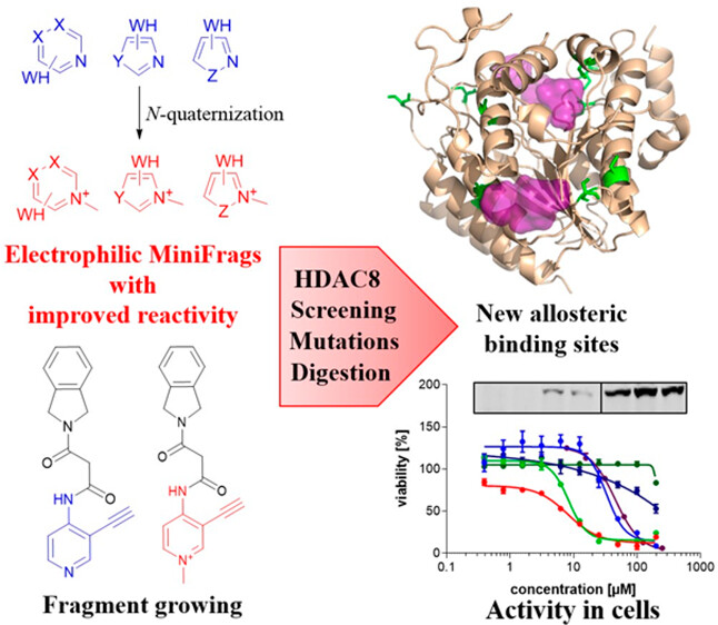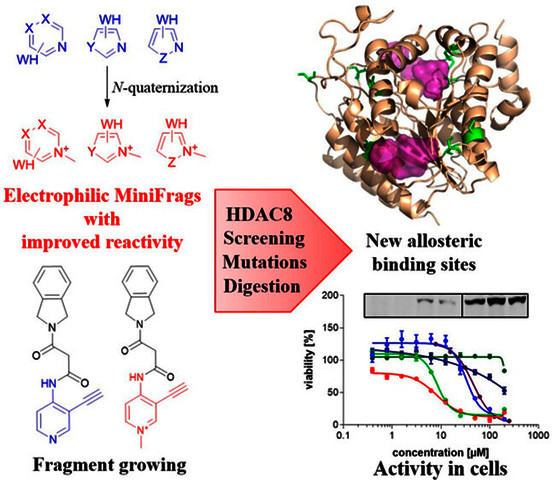 Screening of ultra-low-molecular weight ligands (MiniFrags) successfully identified viable chemical starting points for a variety of drug targets. Here we report the electrophilic analogues of MiniFrags that allow the mapping of potential binding sites for covalent inhibitors by biochemical screening and mass spectrometry. Small electrophilic heterocycles and their N-quaternized analogues were first characterized in the glutathione assay to analyze their electrophilic reactivity. Next, the library was used for systematic mapping of potential covalent binding sites available in human histone deacetylase 8 (HDAC8). The covalent labeling of HDAC8 cysteines has been proven by tandem mass spectrometry measurements, and the observations were explained by mutating HDAC8 cysteines. As a result, screening of electrophilic MiniFrags identified three potential binding sites suitable for the development of allosteric covalent HDAC8 inhibitors. One of the hit fragments was merged with a known HDAC8 inhibitor fragment using different linkers, and the linker length was optimized to result in a lead-like covalent inhibitor. © 2023 The Authors. Published by American Chemical Society