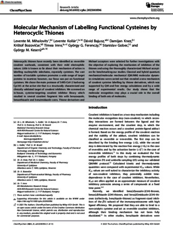 Mihalovits, Levente Márk and Kollár, Levente and Bajusz, Dávid and Knez, Damijan and Bozovičar, Krištof and Imre, Timea and Ferenczy, György and Gobec, Stanislav and Keserű, György Miklós (2024) Molecular Mechanism of Labelling Functional Cysteines by Heterocyclic Thiones. CHEMPHYSCHEM: A EUROPEAN JOURNAL OF CHEMICAL PHYSICS AND PHYSICAL CHEMISTRY, 25 (1). No. e202300596. ISSN 1439-4235