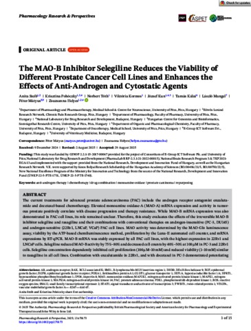 Steib, Anita and Pohóczky, Krisztina and Tóth, Norbert and Kormos, Viktória and Kun, József and Kálai, Tamás and Mangel, László Csaba and Mátyus, Péter and Helyes, Zsuzsanna (2025) The MAO-B Inhibitor Selegiline Reduces the Viability of Different Prostate Cancer Cell Lines and Enhances the Effects of Anti-Androgen and Cytostatic Agents. PHARMACOLOGY RESEARCH AND PERSPECTIVES, 13 (5). No.-e70173. ISSN 2052-1707