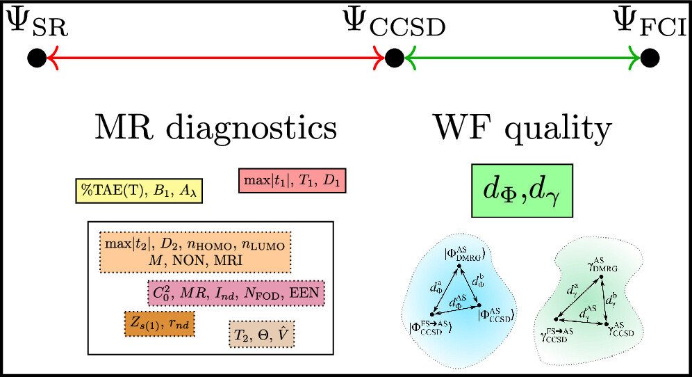 A new approach is proposed to assess the reliability of the truncated wave function methods by estimating the deviation from the full configuration interaction (FCI) wave function. While typical multireference diagnostics compare some derived property of the solution with the ideal picture of a single determinant, we try to answer a more practical question: how far is the solution from the exact one. Using the density matrix renormalization group (DMRG) method to provide an approximate FCI solution for the self-consistently determined relevant active space, we compare the low-level CI expansions and one-body reduced density matrixes to determine the distance of the two solutions (d̃Φ, d̃γ). We demonstrate the applicability of the approach for the CCSD method by benchmarking on the W4–17 data set, as well as on transition-metal-containing species. We also show that the presented moderate-cost, purely wave function-based metric is truly unique in the sense that it does not correlate with any popular multireference measures. We also explored the usage of CCSD natural orbitals (d̃γ,NO) and its effect on the active space size and the metric. The proposed diagnostic can also be applied to other wave function approximations, and it has the potential to provide a quality measure for post-Hartree–Fock procedures in general.