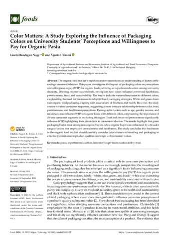 Nagy, László Bendegúz and Temesi, Ágoston (2024) Color Matters: A Study Exploring the Influence of Packaging Colors on University Students’ Perceptions and Willingness to Pay for Organic Pasta. FOODS, 13 (19). No.-3112. ISSN 2304-8158