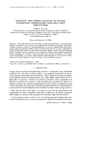 Kovács, Flórián (2004) Mobility and stress analysis of highly symmetric generalised bar-and-joint structures. JOURNAL OF COMPUTATIONAL AND APPLIED MECHANICS, 5 (1). pp. 65-78. ISSN 1586-2070