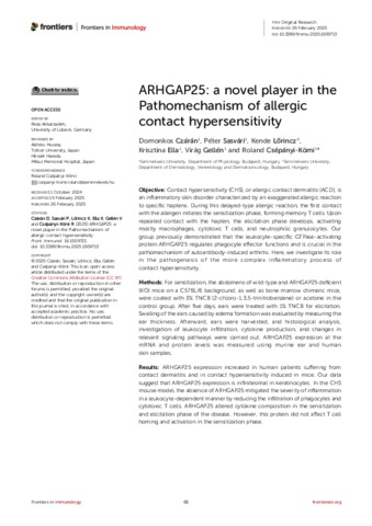 Czárán, Domonkos and Sasvári, Péter and Lőrincz, Kende and Ella, Krisztina and Gellén, Virág and Csépányi-Kömi, Roland (2025) ARHGAP25: a novel player in the Pathomechanism of allergic contact hypersensitivity. FRONTIERS IN IMMUNOLOGY, 16. ISSN 1664-3224