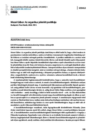 Ágoston, Enikő Anna (2025) Mezei Gábor: Az organikus jelenlét poétikája. IRODALOMTÖRTÉNETI KÖZLEMÉNYEK, 129 (3). pp. 395-399. ISSN 0021-1486