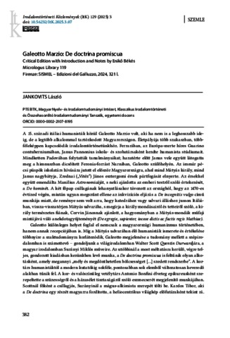Jankovits, László (2025) Galeotto Marzio: De doctrina promiscua. Critical edition with Introduction and Notes by Enikő Békés. IRODALOMTÖRTÉNETI KÖZLEMÉNYEK, 129 (3). pp. 382-385. ISSN 0021-1486