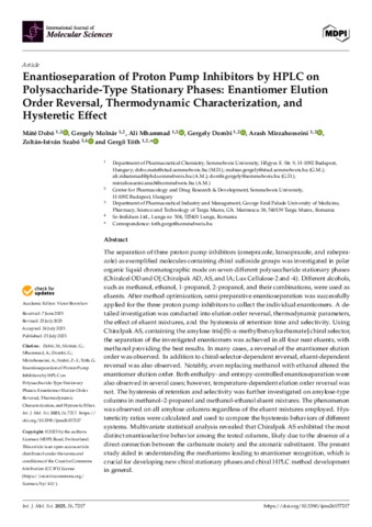 Dobó, Máté and Molnár, Gergely and Mhammad, Ali and Dombi, Gergely and Mirzahosseini, Arash and Szabó, Zoltán-István and Tóth, Gergő (2025) Enantioseparation of Proton Pump Inhibitors by HPLC on Polysaccharide-Type Stationary Phases: Enantiomer Elution Order Reversal, Thermodynamic Characterization, and Hysteretic Effect. International Journal of Molecular Sciences, 26 (15). No.-7217. ISSN 1422-0067