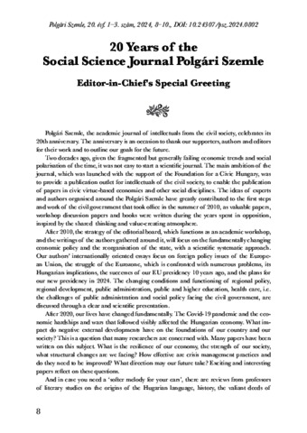 Lentner, Csaba (2024) 20 Years of the Social Science Journal Polgári Szemle : Editor-in-Chief's Special Greeting. POLGÁRI SZEMLE, 20 (1-3). pp. 8-10. ISSN 1786-6553 (print); 1786-8823 (online)