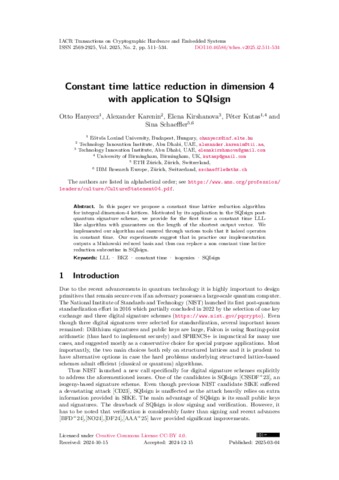 Hanyecz, Ottó and Karenin, Alexander and Kirshanova, Elena and Kutas, Péter and Schaeffler, Sina (2025) Constant time lattice reduction in dimension 4 with application to SQIsign. IACR TRANSACTIONS ON CRYPTOGRAPHIC HARDWARE AND EMBEDDED SYSTEMS, 2025 (2). pp. 511-534. ISSN 2569-2925