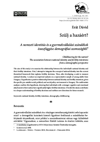 Erát, Dávid (2025) Szülj a hazáért? : A nemzeti identitás és a gyermekvállalási szándékok összefüggése demográfiai szemszögből = Childbearing for the nation? : The association between national identity and fertility intentions from a demographic perspective. STUDIA QUINQUEECCLESIENSIA, 1. pp. 93-107. ISSN 3094-2608