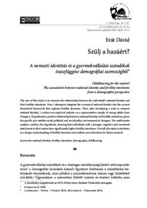 Childbearing for the nation?The association between national identity and fertility intentions from a demographic perspectiveThe aim of this study is to examine the relationship between the individual’s national identity and their fertility intentions. First, I attempt to integrate the concept of national identity into the current theoretical framework that explains fertility decisions. Then, after developing a scale to measure national identity, I conduct an empirical analysis on a representative sample of young adults from Hungary. I hypothesize a positive relationship between national identity and fertility intentions, given the specific pro-natalist social, political, and social policy environment in Hungary. The multivariate analyses confirm this hypothesis, showing that individuals with a stronger cognitive and emotional attachment to their nation have significantly higher fertility intentions. Overall, this study contributes to a deeper understanding of fertility decisions and outlines new directions for future research.