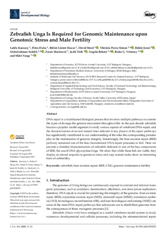 Kazzazy, Latifa and Huba, Flóra and Hausz, Bálint Lóránt and Mező, Dávid and Perey-Simon, Viktória and Jezsó, Bálint and Seddik, Abdulrahman and Marinović, Zoran and Tóth, Judit and Békési, Angéla and Vértessy, Beáta G. and Varga, Máté (2025) Zebrafish Unga Is Required for Genomic Maintenance upon Genotoxic Stress and Male Fertility. JOURNAL OF DEVELOPMENTAL BIOLOGY, 13 (3). p. 32. ISSN 2221-3759