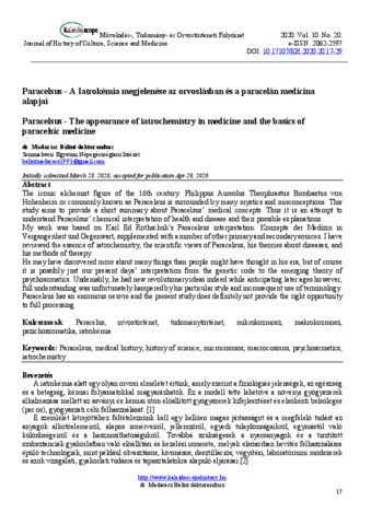 Madarász, Bálint (2020) Paracelsus - A iatrokémia megjelenése az orvoslásban és a paracelán medicina alapjai. KALEIDOSCOPE: MŰVELŐDÉS- TUDOMÁNY- ÉS ORVOSTÖRTÉNETI FOLYÓIRAT, 10 (20). pp. 17-29. ISSN 2062-2597