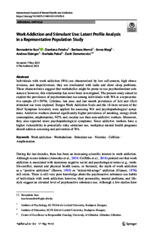 Kun, Bernadette and Fetahu, Dardana and Mervó, Barbara and Magi, Anna and Eisinger, Andrea and Paksi, Borbála and Demetrovics, Zsolt (2025) Work Addiction and Stimulant Use: Latent Profile Analysis in a Representative Population Study. INTERNATIONAL JOURNAL OF MENTAL HEALTH AND ADDICTION, 23. pp. 105-126. ISSN 1557-1874, ESSN: 1557-1882