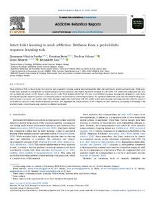 Work addiction (WA) is characterized by excessive and compulsive working patterns that detrimentally affect the individual’s health and functioning. While prior studies have indicated an overreliance on habit learning in various addictions, this study is the first to examine its role in WA. 104 adults were categorized into lowrisk and high-risk groups for WA based on their scores on the Work Addiction Risk Test. We used a probabilistic sequence learning task designed to assess habit learning through the implicit acquisition of structured patterns characterized by alternating sequences. No significant differences were observed between the groups, both in terms of accuracy and reaction time. These findings suggest that individuals with WA exhibit intact habit learning, indicating that the addictive nature of work behavior may not solely stem from habitual processes. This highlights the unique features of WA compared to other addictions, potentially contributing to the relatively better overall functioning observed in affected individuals.