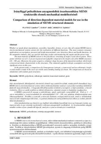 Akár okostelefonról, fülhallgatóról, okosóráról, drónról vagy autóról beszélünk, mindegyikről elmondható, hogy MEMS (micro-electromechanical system, mikro-elektromechanikai rendszer) szenzorokat tartalmaz különböző funkciók megvalósításához. A leggyakoribb felhasználási területek a navigáció, a lépésszámlálás, a beszéd érzékelése, illetve az autók esetében az ütközés felismerése, valamint a motor és hajtáslánc megfigyelése. A MEMS szenzorok fő anyaga a poliszilícium, amely egykristály szemcsékből áll. Ezek az 1 – 2 µm-es méretükkel a szenzorstruktúrák kis méretskálájából (10 – 100 µm) adódóan általánosságban nem elhanyagolhatóak. Továbbá a szemcsék a növesztés hatására oszlopszerűek lesznek, amely a struktúrának transzverzális tulajdonságot kölcsönöz. A gyakran alkalmazott izotróp feltételezéssel ebben az esetben jelentős hibát követhetünk el. Jelen tanulmányban egy húzott és egy hajlított rúd példáján hasonlítjuk össze egy homogén izotróp, egy transzverzális és egy ortotróp (egykristály) szilícium anyagmodell viselkedését. Az összehasonlítás alapját mindkét esetben olyan szimulációk képezik, amelyek a szemcse-elrendezést is modellezik. | Whether we speak about smartphones, wearables, hearables, drones, or cars, they all contain MEMS (microelectro-mechanical system) sensors for the realization of different functions. The most common consumer applications are navigation, pressure and height measurement, voice detection, fitness and health functions. In the automotive industry, they are used for detecting crashes and monitoring the engine and the power train. The main material of MEMS sensors is the polysilicon, consisting of single crystal silicon grains. These grains with their size of 1–2 µm are in general not negligible compared to the length scale of the MEMS structures (10 – 100 µm). Moreover, the grains acquire a columnar shape because of the deposition method, which lends a transversal elastic characteristic to the structures. The commonly applied isotropic assumption can lead to significant errors in this case. In the present study, a comparison of a homogeneous isotropic, a transversal and an orthotropic (singlecrystal) model is made in the cases of a tensile and a bending loading of a beam. The comparisons are based on simulations with random grain structures.