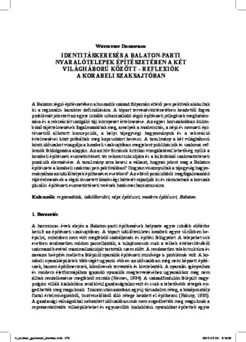 Wettstein, Domonkos (2025) Identitáskeresés a Balaton-parti nyaralótelepek építészetében a két világháború között : reflexiók a korabeli szaksajtóban. In: A múltban gyökerező identitás jelene és jövője. Tinta Könyvkiadó, Veszprém, pp. 370-384. ISBN 9789634094852