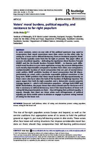 Mráz, Attila Gergely (2025) Voters’ moral burdens, political equality, and resistance to far-right populism. CRITICAL REVIEW OF INTERNATIONAL SOCIAL AND POLITICAL PHILOSOPHY, 28 (5). pp. 773-794. ISSN 1369-8230