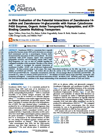 Telbisz, Ágnes and Kaci, Hana and Bakos, Éva and Nagymihály, Zoltán and Both, Eszter Borbála and Lambert, Nándor and Özvegy-Laczka, Csilla and Poór, Miklós (2025) In vitro evaluation of the potential interactions of zearalenone-14-sulfate and zearalenone-14-glucuronide with human cytochrome P450 enzymes, organic anion transporting polypeptides and ATP-binding cassette multidrug transporters. ACS OMEGA, 10 (29). pp. 32466-32475. ISSN 2470-1343