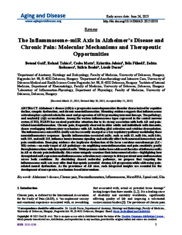 Botond, Gaál and Roland, Takács and Csaba, Matta and Krisztián, Juhász and Béla, Fülesdi and Zoltán, Szekanecz and Szilvia, Benkő and László, Ducza (2025) The Inflammasome-miR Axis in Alzheimer’s Disease and Chronic Pain: Molecular Mechanisms and Therapeutic Opportunities. AGING AND DISEASE. ISSN 21525250 (In Press)
