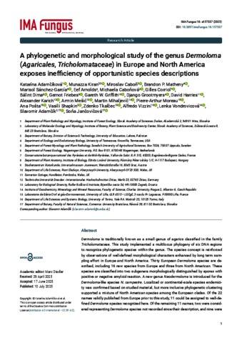Adamčíková, Katarína and Kiran, Munazza and Caboň, Miroslav and Matheny, Brandon P. and Sánchez-García, Marisol and Arnolds, Eef and Caboňová, Michaela and Corriol, Gilles and Dima, Bálint and Friebes, Gernot and Griffith, Gareth W. and Grootmyers, Django and Harries, David and Karich, Alexander and Mešić, Armin and Mihaljevič, Martin and Moreau, Pierre-Arthur and Pošta, Ana and Shapkin, Vasilii and Tkalčec, Zdenko and Vizzini, Alfredo and Vondrovicová, Lenka and Adamčík, Slavomir and Jančovičová, Soňa (2025) A phylogenetic and morphological study of the genus Dermoloma (Agaricales, Tricholomataceae) in Europe and North America exposes inefficiency of opportunistic species descriptions. IMA FUNGUS, 16. No.-e157337. ISSN 2210-6340