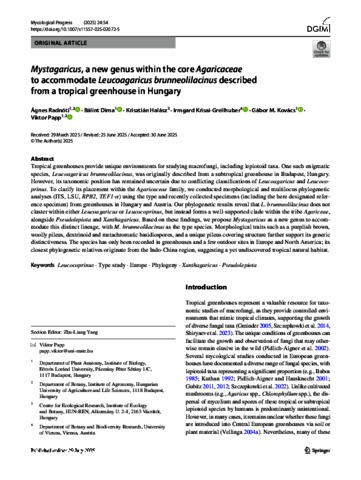 Radnóti, Ágnes and Dima, Bálint and Halász, Krisztián and Krisai-Greilhuber, Irmgard and Kovács, M. Gábor and Papp, Viktor (2025) Mystagaricus, a new genus within the core Agaricaceae to accommodate Leucoagaricus brunneolilacinus described from a tropical greenhouse in Hungary. MYCOLOGICAL PROGRESS, 24 (1). No.-54. ISSN 1617-416X