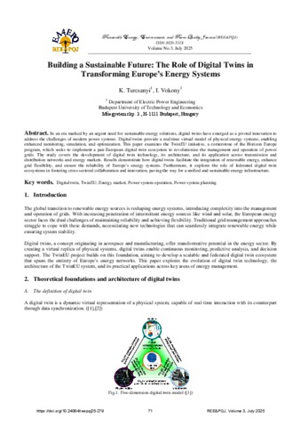 Turcsanyi, Kristof and Vokony, István (2025) Building a Sustainable Future: The Role of Digital Twins in Transforming Europe’s Energy Systems. RENEWABLE ENERGY ENVIRONMENT AND POWER QUALITY JOURNAL, 3. pp. 71-77. ISSN 3020-531X