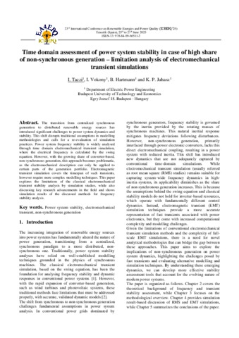 Taczi, Istvan and Vokony, István and Hartmann, Bálint and Juhasz, Kristof Peter (2025) Time domain assessment of power system stability in case of high share of non-synchronous generation – limitation analysis of electromechanical transient simulations. In: 23rd International Conference on Renewable Energies and Power Quality.