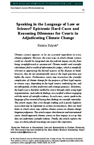 Sulyok, Katalin (2024) Speaking in the Language of Law or Science? Epistemic Hard Cases and Reasoning Dilemmas for Courts in Adjudicating Climate Change. NEW ZEALAND JOURNAL OF ENVIRONMENTAL LAW, 28. pp. 21-47.