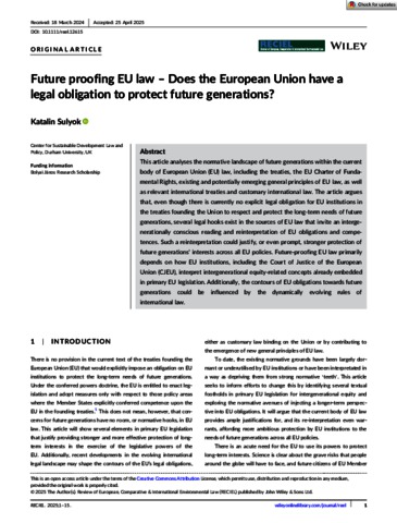 Sulyok, Katalin (2025) Future proofing EU law : Does the European Union have a legal obligation to protect future generations? RECIEL, 34 (2). pp. 420-434.