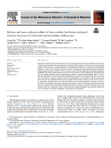 Hou, Cong and Nemes-Károly, István and Pastrav, Leonard and Vrancken, Bey and Kocsis, György and Szebényi, Gábor and Czigány, Tibor and Denis, Kathleen (2025) Friction and wear reduction effect of laser powder bed fusion produced Voronoi structures in lubricated metal-polymer sliding pairs. JOURNAL OF THE MECHANICAL BEHAVIOR OF BIOMEDICAL MATERIALS, 171. No.-107138. ISSN 1751-6161