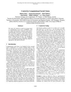 Chen, Jiehua and Kaczmarek, Joanna and Nüsken, Paul and Rothe, Jörg and Schlotter, Ildikó Anna and Seeger, Tessa (2025) Control in Computational Social Choice. In: Proceedings of the Thirty-Fourth International Joint Conference on Artificial Intelligence. International Joint Conferences on Artificial Intelligence Organization, California, pp. 10391-10399. ISBN 9781956792065