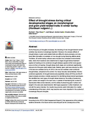 Berki, Zita and Kiss, Tibor and Bányai, Judit and Cseh, András and Balla, Krisztina and Karsai, Ildikó (2025) Effect of drought stress during critical developmental stages on morphological and grain yield-related traits in winter barley (Hordeum vulgare L.). PLOS ONE. No. e0329391. ISSN 1932-6203