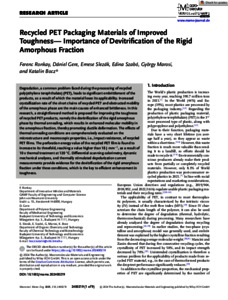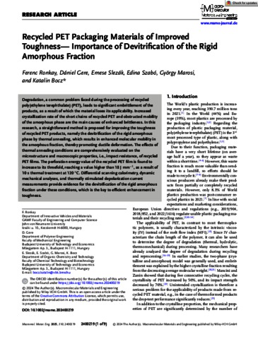 Ronkay, Ferenc and Gere, Dániel and Slezák, Emese and Szabó, Edina and Marosi, György and Bordácsné Bocz, Katalin (2025) Recycled PET Packaging Materials of Improved Toughness : Importance of Devitrification of the Rigid Amorphous Fraction. MACROMOLECULAR MATERIALS AND ENGINEERING, 310 (2). No. 2400219. ISSN 1438-7492
