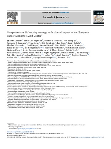 Oskolas, Henriett and Nogueira, Fábio C.N. and Domont, Gilberto B. and Yu, Kun-Hsing and Semenov, Yevgeniy R. and Sorger, Peter and Steinfelder, Erik and Corps, Les and Schulz, Lesley and Wieslander, Elisabet and Fenyö, David and Kárpáti, Sarolta and Holló, Péter and Kemény, Lajos V. and Döme, Balazs and Megyesfalvi, Zsolt and Pawłowski, Krzysztof and Nishimura, Toshihide and Kwon, HoJeong and Encarnación-Guevara, Sergio and Szasz, A. Marcell and Veréb, Zoltán and Gyulai, Rolland and Németh, István Balázs and Appelqvist, Roger and Rezeli, Melinda and Baldetorp, Bo and Horvatovich, Peter and Malmström, Johan and Pla, Indira and Sanchez, Aniel and Knudsen, Beatrice and Kiss, András and Malm, Johan and Marko-Varga, György and Gil, Jeovanis (2025) Comprehensive biobanking strategy with clinical impact at the European Cancer Moonshot Lund Center. Journal of Proteomics, 316. No.-105442. ISSN 18743919