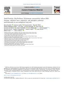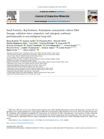 Ernhofer, Büsra and Spittler, Andreas and Ferk, Franziska and Mišík, Miroslav and Zylka, Martha Magdalena and Glatt, Lisa and Boettiger, Kristiina and Solta, Anna and Kirchhofer, Dominik and Timelthaler, Gerald and Megyesfalvi, Zsolt and Kopatz, Verena and Kovar, Heinrich and Knasmueller, Siegfried and Aigner, Clemens and Kenner, Lukas and Döme, Balázs and Schelch, Karin (2025) Small Particles, Big Problems: Polystyrene nanoparticles induce DNA damage, oxidative stress, migration, and mitogenic pathways predominantly in non-malignant lung cells. JOURNAL OF HAZARDOUS MATERIALS, 495. p. 139129. ISSN 0304-3894
