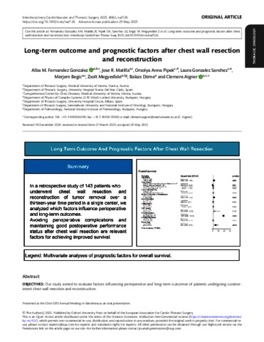 Fernandez Gonzalez, Alba M and Matilla, Jose R and Pipek, Orsolya Anna and Sanchez, Laura Gonzalez and Begic, Merjem and Megyesfalvi, Zsolt and Döme, Balázs and Aigner, Clemens (2025) Long-term outcome and prognostic factors after chest wall resection and reconstruction. INTERDISCIPLINARY CARDIOVASCULAR AND THORACIC SURGERY, 40 (6). No. ivaf126. ISSN 2753-670X
