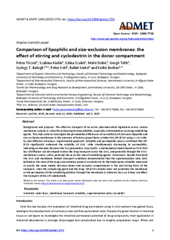 Tőzsér, Petra and Kádár, Szabina and Szabó, Edina and Dobó, Máté and Tóth, Gergő and Balogh, György Tibor and Sóti, Péter and Sinkó, Bálint and Borbás, Enikő (2025) Comparison of lipophilic and size-exclusion membranes: the effect of stirring and cyclodextrin in the donor compartment. ADMET AND DMPK, 13 (4). No.-2753. ISSN 1848-7718