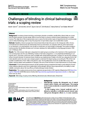Szendi, Katalin and Lohner, Szimonetta and Szenczi, Ágnes and Murányi, Edit and Berényi, Károly and Nemeth, Balazs (2025) Challenges of blinding in clinical balneology trials: a scoping review. BMC COMPLEMENTARY MEDICINE AND THERAPIES, 25 (1). No. -132. ISSN 2662-7671